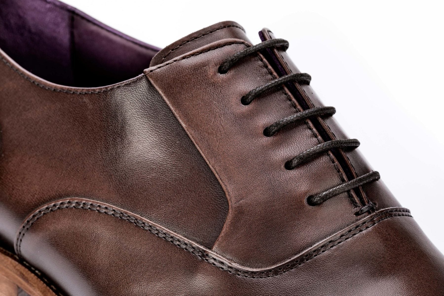 PIEL DE VACUNO DEBIDAMENTE IDENTIFICADA, COSIDA Y PATINADA A MANO (A PÁTINA), EL FORRO INTERIOR ESTÁ ELABORADO CON LA MISMA PIEL CON LA QUE SE HA TRABAJADO EL OXFORD. LA PARTE DEL EMPEINE LLEVA UN COSIDO INVISIBLE COMO UN DETALLE PARA ARMONIZAR EL MODELO. LA SUELA ES DE CUERO VEGETAL CON UN ANTIDESLIZANTE EN EL TACÓN.